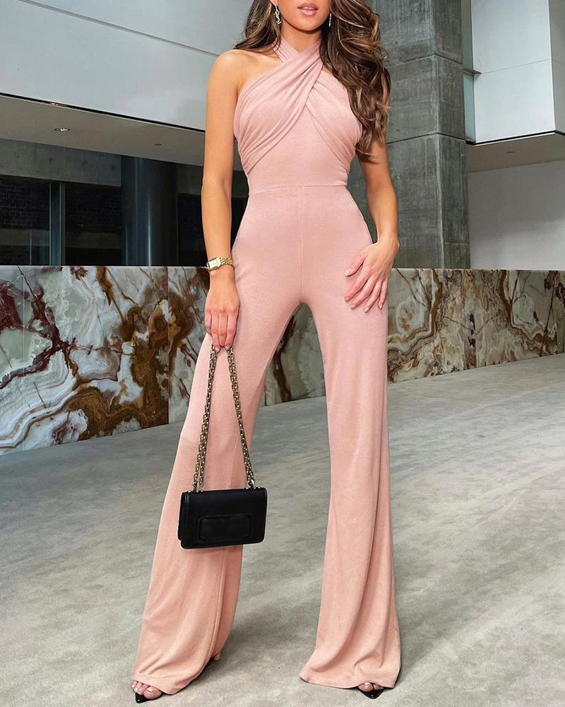 Style:Chic Type:Jumpsuit Material:95%Polyester,5%Elastane Neckline:Halter Sleeve Style:Sleeveless Length:Long Pattern Type:Plain Decoration:Ruched Fit Type:Skinny Occasion:Daily Package Include:1*Jumpsuit