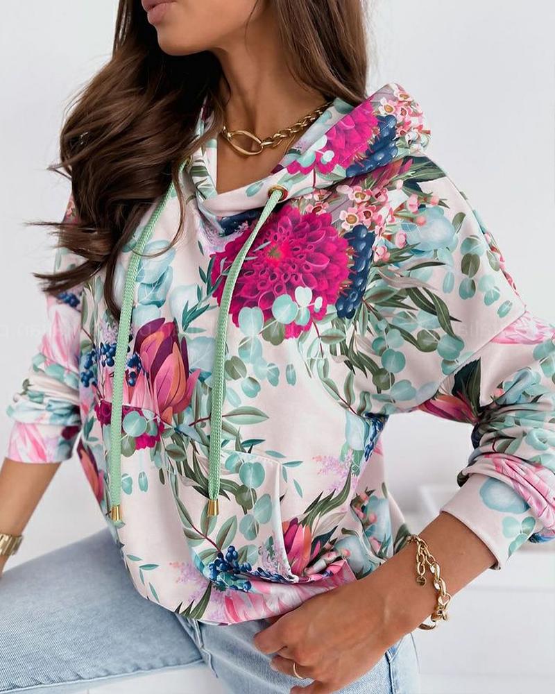 Floral Print Drawstring Hooded Pocket Sweatshirt