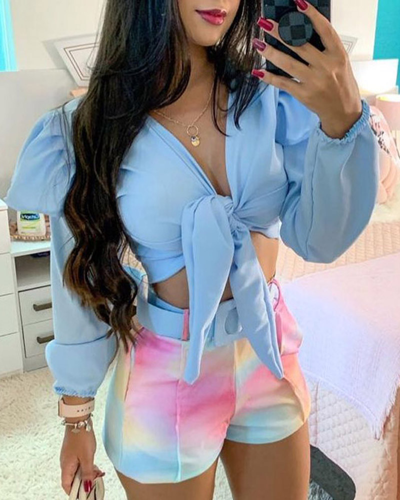 Style:Casual,Chic Type:Shorts Set Material:Polyester Neckline:V-Neck Sleeve Style:Long Sleeve Length:Above Knee Pattern Type:Ombre,Plain,Tie Dye Decoration:Tied Detail Fit Type:Skinny With Belt:No Occasion:Daily Package Include:1*Shorts Set (Without Belt)
