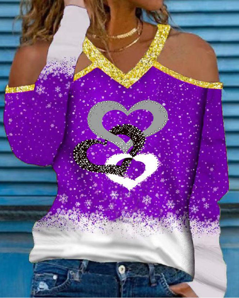 Christmas Snowflake Heart Print Cold Shoulder Top
