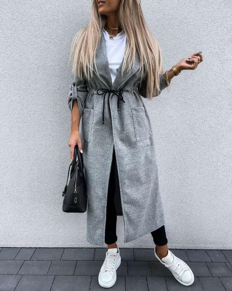 Style:Casual Type:Coat Material:Polyester Neckline:Turn-down Collar Sleeve Style:Three Quarters,Roll Up Sleeve Length:Long Pattern Type:Plain Decoration:Pocket,Drawstring Fit Type:Regular Occasion:Daily Package Include:1*Coat