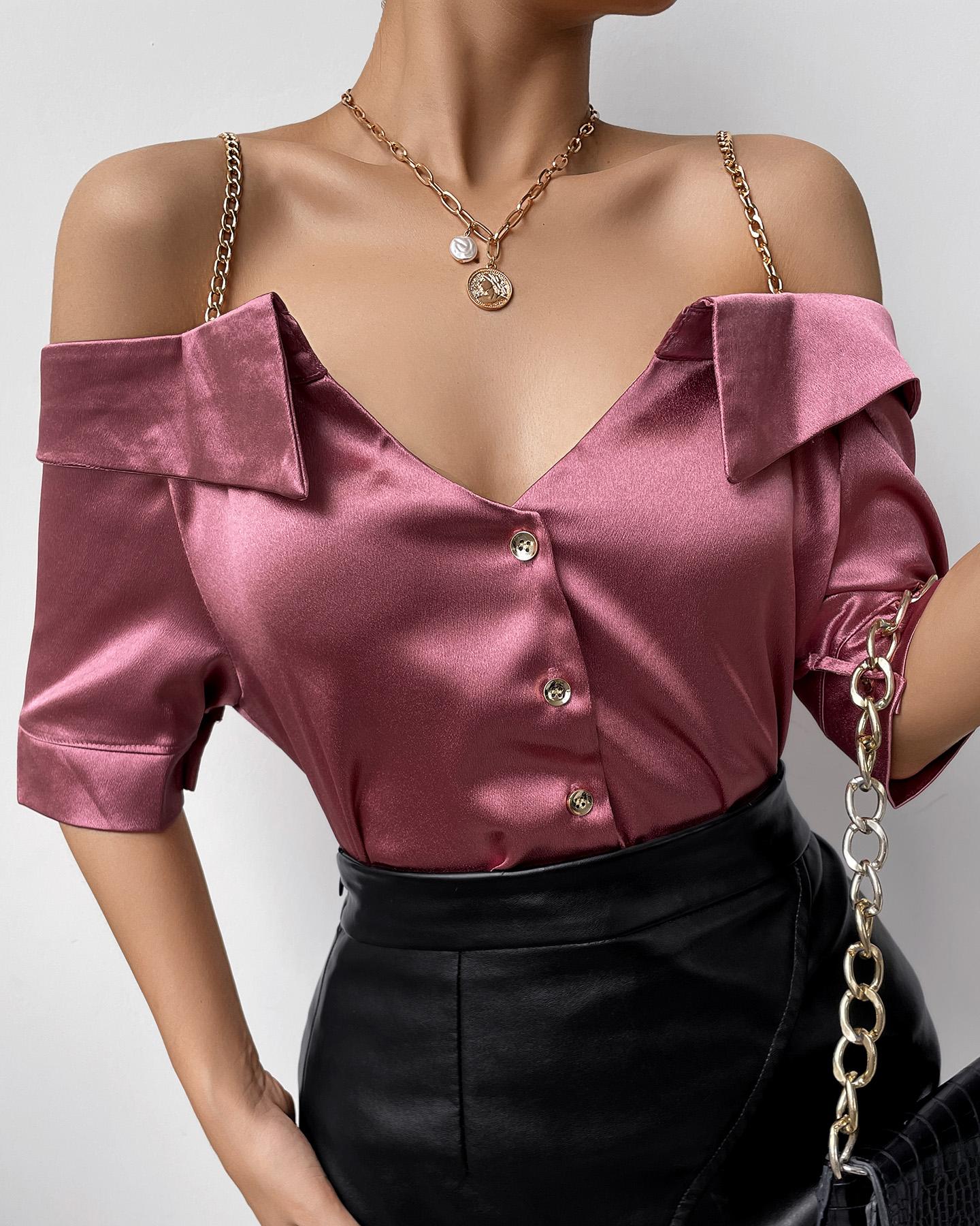 Cold Shoulder Chain Strap Satin Buttoned Top