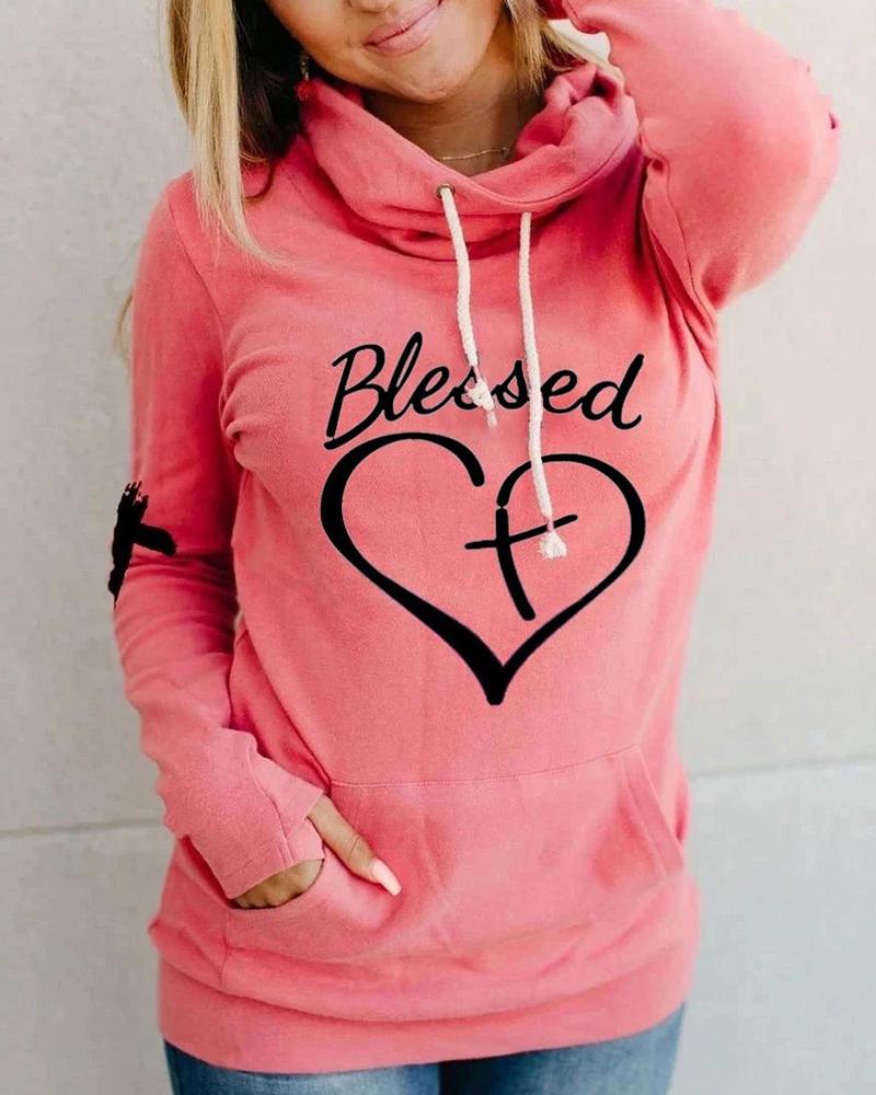 Letter Heart Print Hooded Long Sleeve Sweatshirt