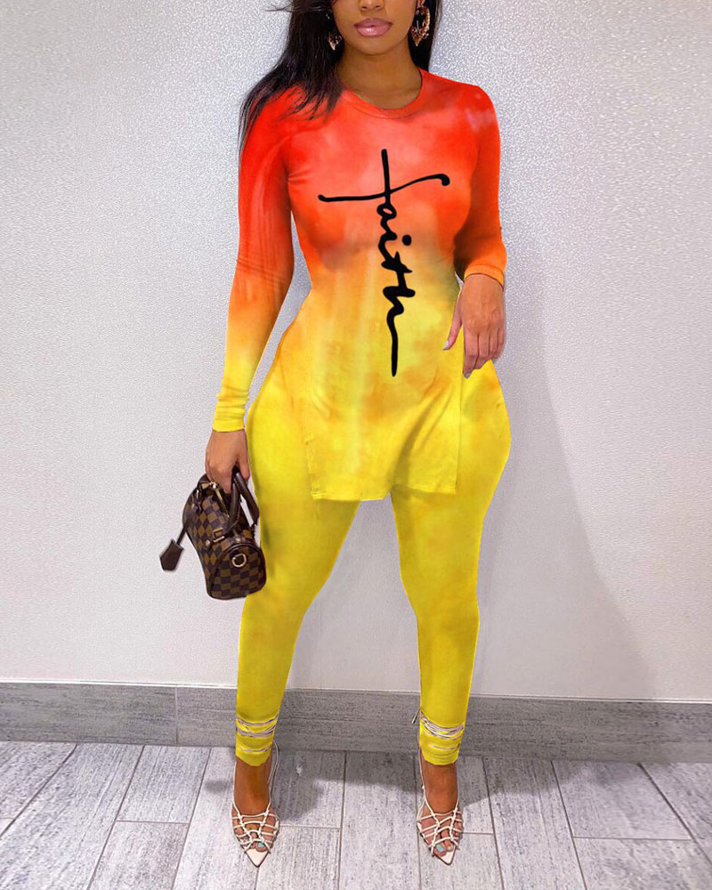 Faith Ombre Print Long Sleeve Split Hem Top & Pants Set