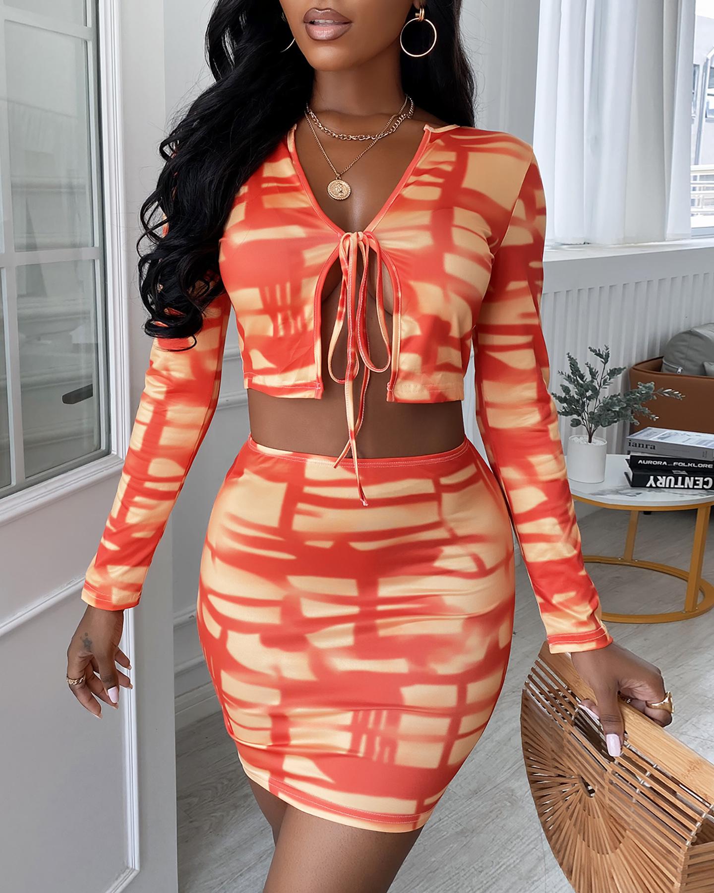Style:Casual,Chic,Elegant,Sexy Type:Skirt Sets Material:Polyester Neckline:V-Neck Sleeve Style:Long Sleeve Length:Regular Pattern Type:Tie Dye Decoration:Lace-up Fit Type:Regular With Belt:No Occasion:Daily Package Include:2PCS
