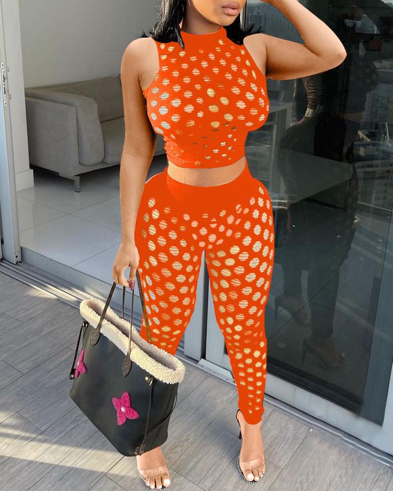 Style:Chic Type:Pants Sets Material:Polyester Neckline:O-neck Sleeve Style:Sleeveless Length:Long Pattern Type:Plain Decoration:Hollow-out,High Waist Fit Type:Regular Occasion:Daily Package Include:Pants Set