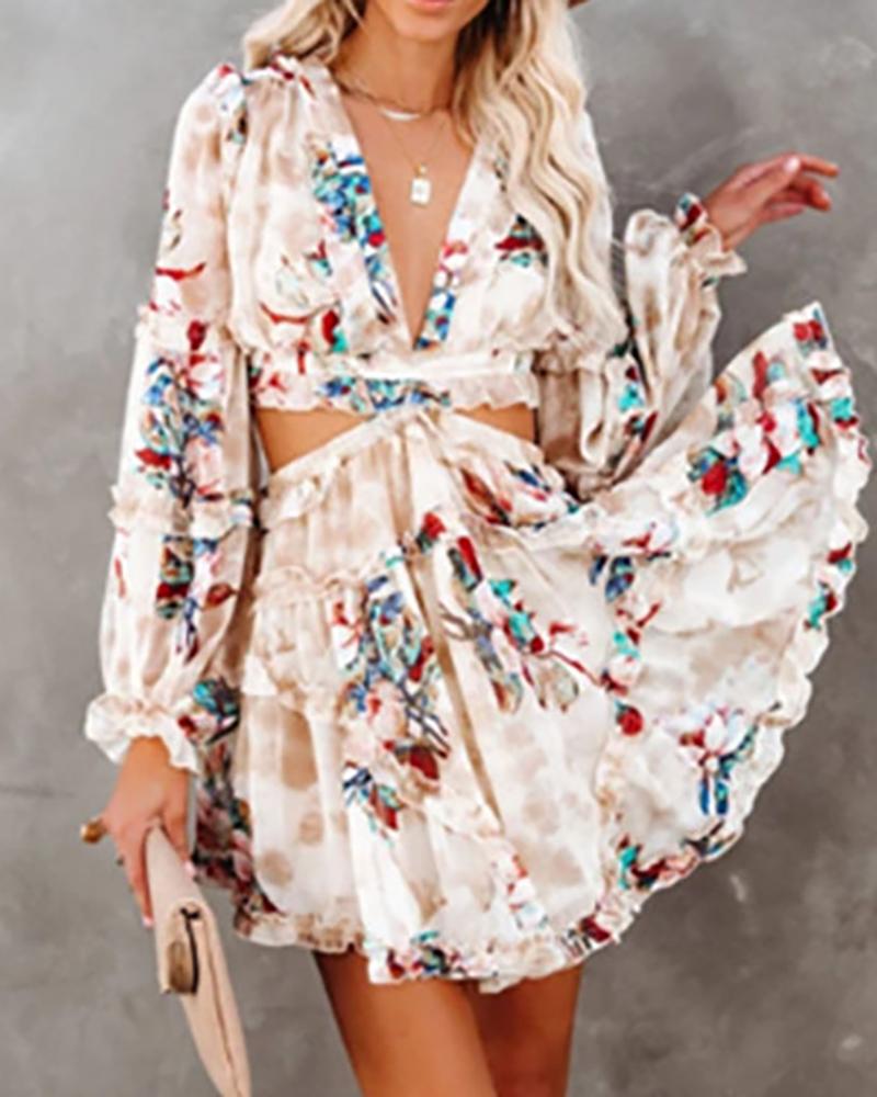 Style:Casual Type:Regular Material:Polyester Neckline:V-Neck Sleeve Style:Long Sleeve Length:Mini Pattern Type:Floral Decoration:Cutout Fit Type:Regular Occasion:Daily Package Include:1* Dress