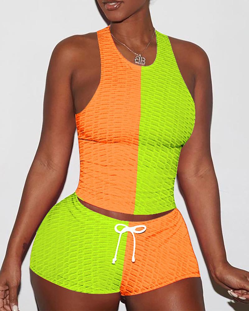 Colorblock Patchwork O Neck Sleeveless Lace Up Bodycon Top & Shorts Sets