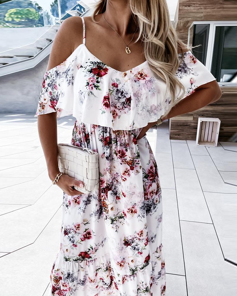 Cold Shoulder Floral Print Ruffles Maxi Dress