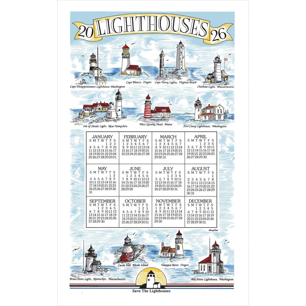 A lighthouse is a beacon that will always lead you home! Featuring renditions of lighthouses from all over coastal USA, this calendar towel makes a statement that shines bright in the kitchen, galley, and coastal inspired home. Calendar towels have become cherished reusable collectibles, and have consistently been rated one of the top gift ideas of the century! What other textile serves so many purposes? Use it for the year as a beautiful wall-hanging calendar, and then forever as a collectible and vintage kitchen towel! There are many projects that allow you to reuse this textile art for crafters- sew it into a pillow, quilt, frame it, make curtains - your creativity creates the possibilities! Calendar towels make thoughtful gifts to send to a friend and include dowels, coupling, cord, and a mailable gift box. They are also a great gift for that hard-to-shop-for person on your list, to commemorate a special year.