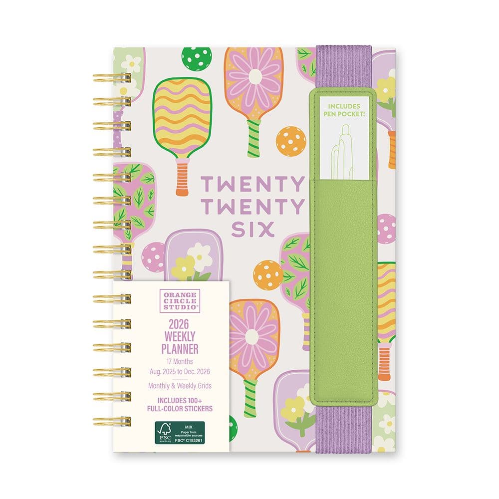 Stay organized and inspired throughout 2026 with the 2026 Pickleball Rally Oliver Planner by Orange Circle Studio. This beautifully designed planner features a vibrant pickleball-themed cover and is equipped with a faux-leather pen pocket for convenience. Perfect for tracking your daily, weekly, and monthly activities, this planner includes goal, budget, mood, and hydration trackers to help you maintain a balanced lifestyle. Enjoy the ease of planning with monthly and weekly spreads, a contacts section, and lined notes pages for additional reminders. Compact size of 5.75 x 8.25 inches, ideal for portability and easy handling Durable Wire-O binding allows the planner to lay flat for ease of use Timespan: 17-month standard from August 2025 to December 2026Includes over 100 full-color stickers to brighten your scheduling Features a faux-leather pen pocket and an elastic band closure to keep your planner secure FSC certified paper, ensuring environmental responsibility Enhance your planning with the Oliver Planner, which not only helps you stay organized but also adds a touch of fun with its colorful design and stickers. Whether you're managing a busy work schedule, organizing school assignments, or planning personal events, this planner is your perfect companion for 2026. Don't miss out on the opportunity to enhance your daily organization. Order your 2026 Pickleball Rally Oliver Planner by Orange Circle Studio today and start planning your year with style and efficiency!