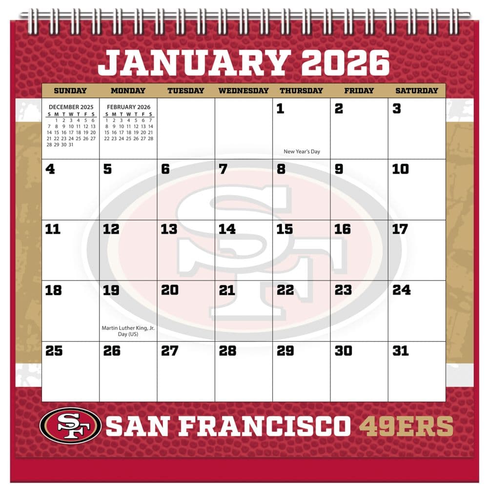 Celebrate your passion for the San Francisco 49ers all year long with the NFL San Francisco 49ers 2026 Easel Desk Calendar. Perfectly designed for easy display, this calendar features a sturdy easel back that fits comfortably on your desk or countertop. Each month showcases bold and vibrant team graphics, making it a must-have for any die-hard fan. Keep track of important dates and team events with style and ease. Features a durable spiral binding for easy page turning throughout the year Includes a small grid size, ideal for quick notes and reminders Made with high-quality paper, ensuring longevity and a premium feel Displays all major U.S. holidays, helping you stay organized Officially licensed by the NFL, guaranteeing authentic team logos and colors This desk calendar not only helps you stay organized but also serves as a daily reminder of your team spirit. It's an excellent gift for any San Francisco 49ers fan or a fantastic addition to your own sports memorabilia collection. Don't miss a game or an important date with this stylish and functional NFL-themed calendar. Show your team pride and keep your schedule in check with the San Francisco 49ers 2026 Desk Calendar. Order now and start planning your year with the 49ers!