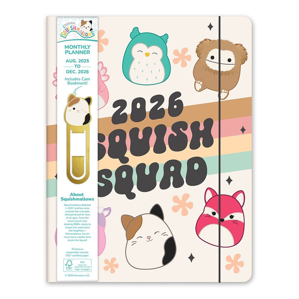 Plan your year with the delightful Squishmallows Monthly 2026 Planner, adorned with vibrant, full-color illustrations of the Squish Squad. This planner is not only a practical tool for organizing your schedule but also a charming companion thanks to its adorable Squishmallows characters. The sturdy case binding and high-quality paper ensure durability and ease of writing, making it perfect for tracking appointments, birthdays, and other significant events. Includes a unique brass-and-enamel Cam bookmark to easily mark your current page. Features a convenient size of 7.5 x 9.75 inches, ideal for both portability and readability. Monthly layout with ample space for notes, plus a two-year reference calendar and a three-year holiday list to keep you well-prepared. Printed on FSC-certified paper, supporting responsible forest management. Case binding provides a lay-flat design, making it easy to write and check your plans. This planner is a must-have for anyone who loves to stay organized and enjoys the cute and cuddly company of Squishmallows. It's perfect for personal use or as a thoughtful gift for a Squishmallows fan. Don't miss out on this essential planning tool that combines functionality with fun! Secure your Squishmallows Monthly 2026 Planner today and make planning an enjoyable part of your daily routine!