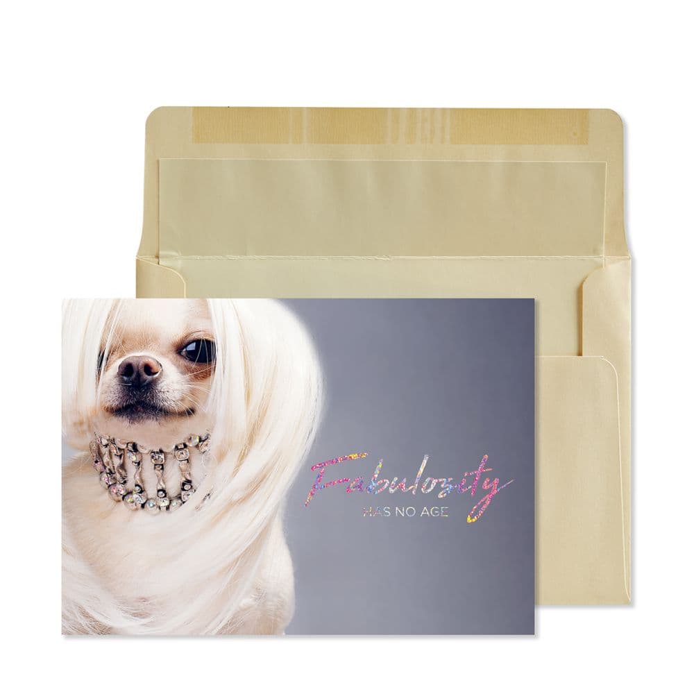 Make someone feel extra special with NIQUEA.D's Photo Glam Dog Birthday Card! This unique birthday card displays a photogenic pup dressed up and posing with a heartfelt sentiment: ?HAPPY BIRTHDAY, GIRL!? Featuring sparkling embellishment with eye catching foil, this card is sure to surprise and delight any dog lover you know. Let them know how much they mean to you and make their day just a bit brighter with the Photo Glam Dog Birthday Card from NIQUEA.D. With its stylish design and quality production, it?s an unforgettable gift for a special person who deserves something special. Celebrate your loved ones all year long with this one of a kind card that?ll have everyone swooning at its cuteness! Occasion: BirthdayMeasures: 7 X 5Embellishment: FoilSentiment: HAPPY BIRTHDAY, GIRL!