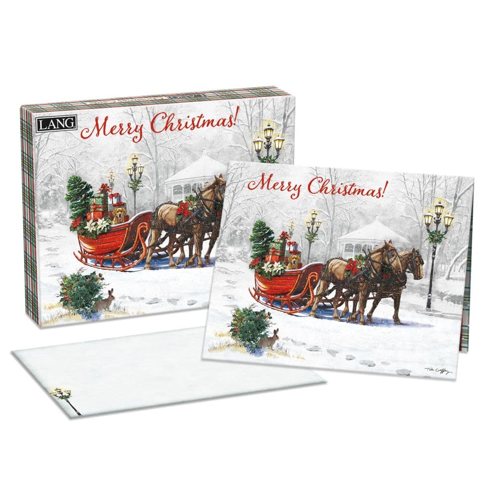 Send season's greetings to your family and friends with Sleigh Bells Ring Boxed Christmas Cards featuring artwork by Tim Coffey! Fill hearts with holiday cheer with cards that combine colorful artwork with holiday greetings inside and out. With LANG quality features like linen embossed paper stock and glitter embellishment, these are a truly special way to connect with loved ones around the holidays!18 Cards and 19 fully designed envelopesFull color artwork inside and outElegant linen embossed paper stockUnique embellishments as notedCards come inside a sturdy, full-color boxCard size: 6.875" X 5.375"Box size: 7.75"w X 6"h X 1.6"d