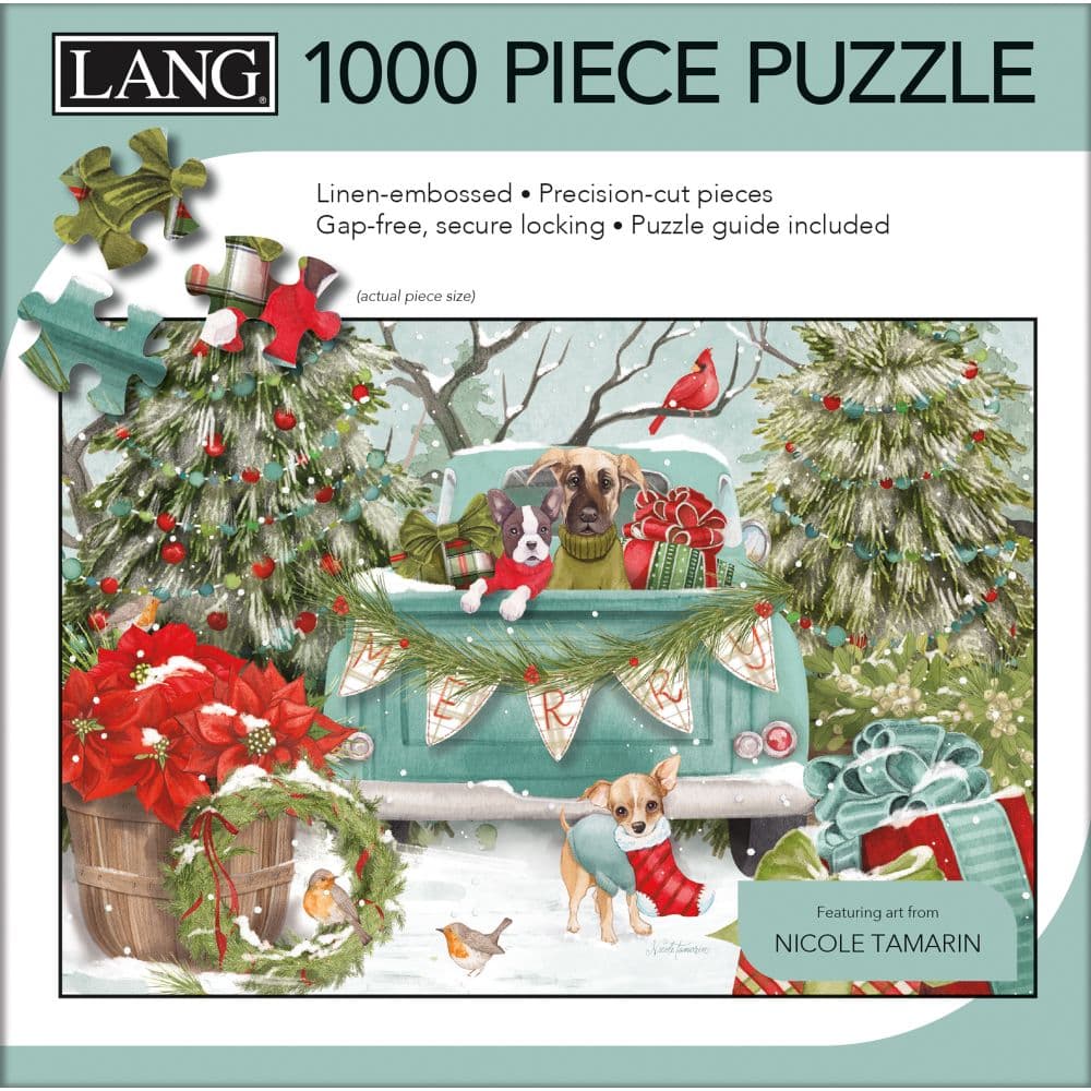 Introducing the Merry Dogs 1000 Piece Puzzle by LANG Companies, featuring the stunning artwork of Nicole Tamarin. This delightful puzzle showcases festive dogs in a seasonal winter scene, capturing the joy and charm of the holiday season. With its 1000 pieces, this puzzle offers a satisfying challenge that will keep you engaged for hours. Each piece is meticulously designed to fit together seamlessly, creating a gap-free and secure locking puzzle experience. The artwork by Nicole Tamarin is brought to life with elegant, linen-embossed paper, adding a touch of sophistication to the finished puzzle. Tamarin's talent shines through in her ability to capture the playful spirit of our furry friends, making this puzzle a delightful addition to any collection. LANG puzzles are known for their exceptional quality and attention to detail, providing a fun and challenging activity for friends and family to enjoy together. The Merry Dogs 1000 Pc Puzzle is no exception, offering a rewarding experience as you piece together Tamarin's beautiful artwork. Immerse yourself in the world of Merry Dogs and let the joyous holiday spirit fill your home with this captivating jigsaw puzzle. It's the perfect way to unwind, relax, and create cherished moments during this festive season.